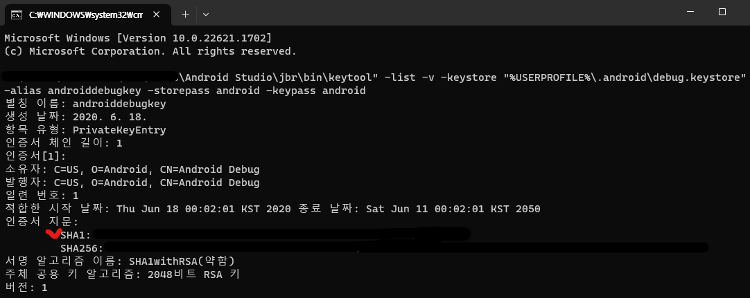 명령어를 입력하였다면 아래와 같은 화면이 출력되는데, 그 중 SHA-1 항목의 값을 SHA-인증서 디지털 지문 칸에 입력합니다.