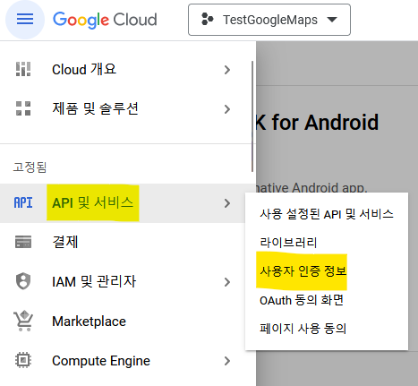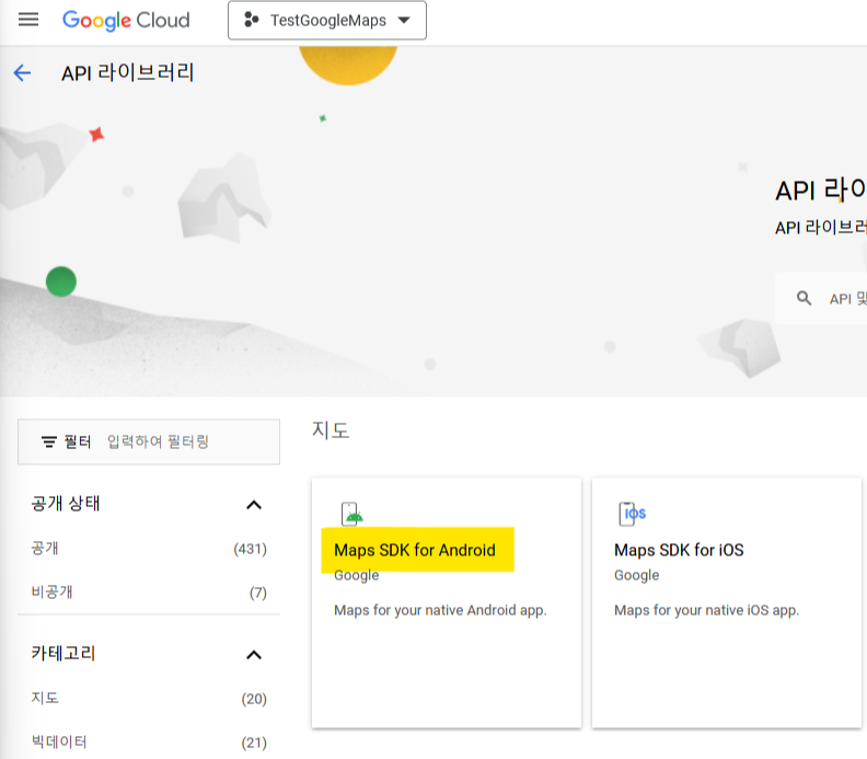 클릭을 하게되면 Google에서 지원하는 API 목록들을 볼 수 있는데, Google Maps API를 사용할 것이기 때문에, Maps SDK for Android를 클릭합니다