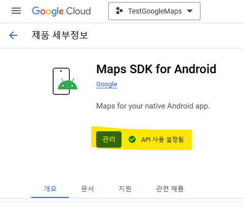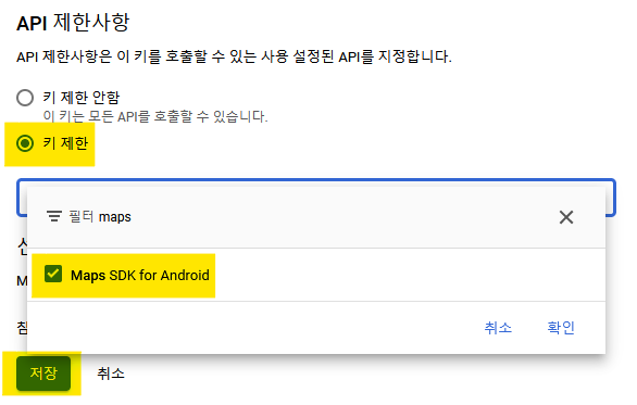 마지막으로 API 제한사항 항목에서 키 제한을 체크하고 바로 아래 API 선택하는 란에 Maps SDK for Android를 선택해줍니다.