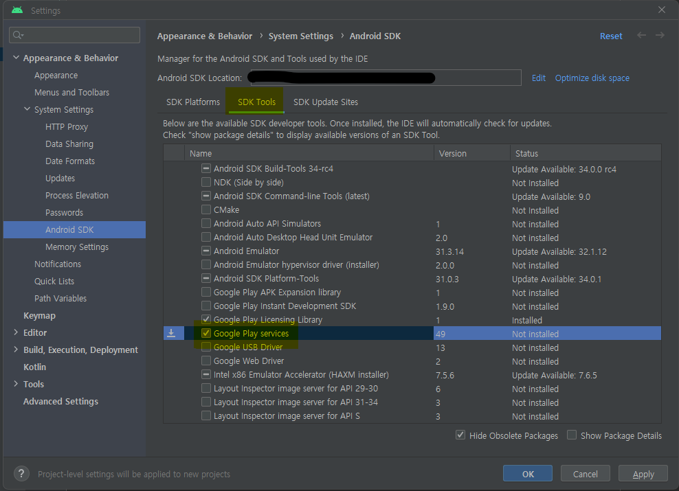 SDK Tools탭을 클릭하여 Google Play Services 항목을 클릭 후 Apply > OK 순으로 클릭합니다.