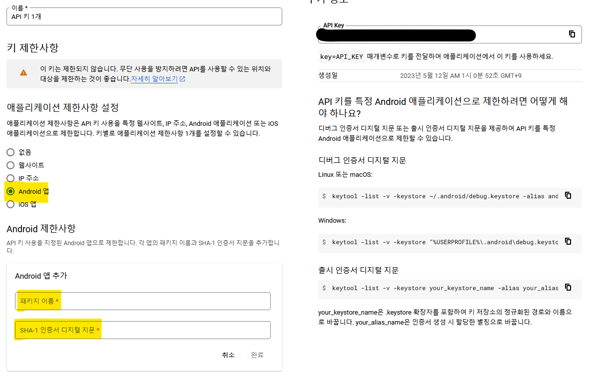 애플리케이션 제한사항 설정 : 저는 Android 앱을 만들기 때문에 Android 앱 에 체크했습니다