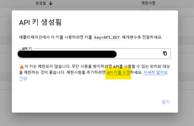 키 생성 중이라는 메세지가 뜨다가, 아래와 같이 API 키가 생성되었습니다. 일단 API 키가 생성되었지만, 아무나 쓰지 못하게 하기 위해서 제한 사항을 추가해야 합니다.