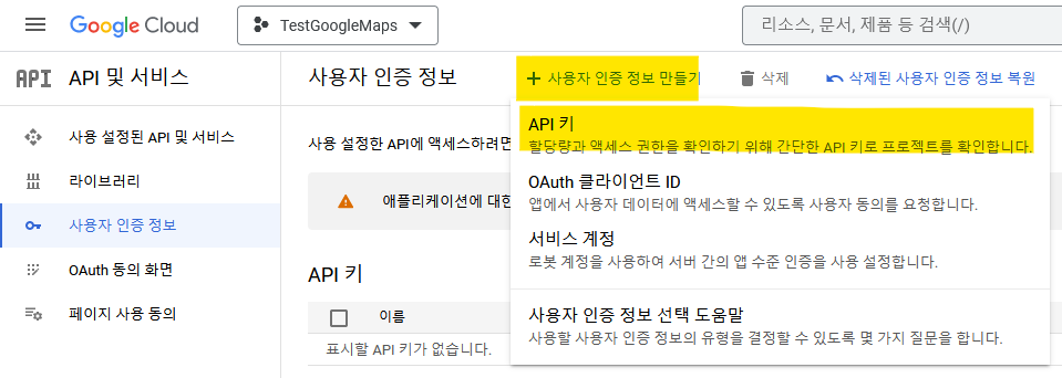 사용자 인증정보 화면에서 + 사용자 인증 정보 만들기 버튼을 클릭한 후, API 키가 필요하기 때문에 해당 메뉴를 클릭한다.