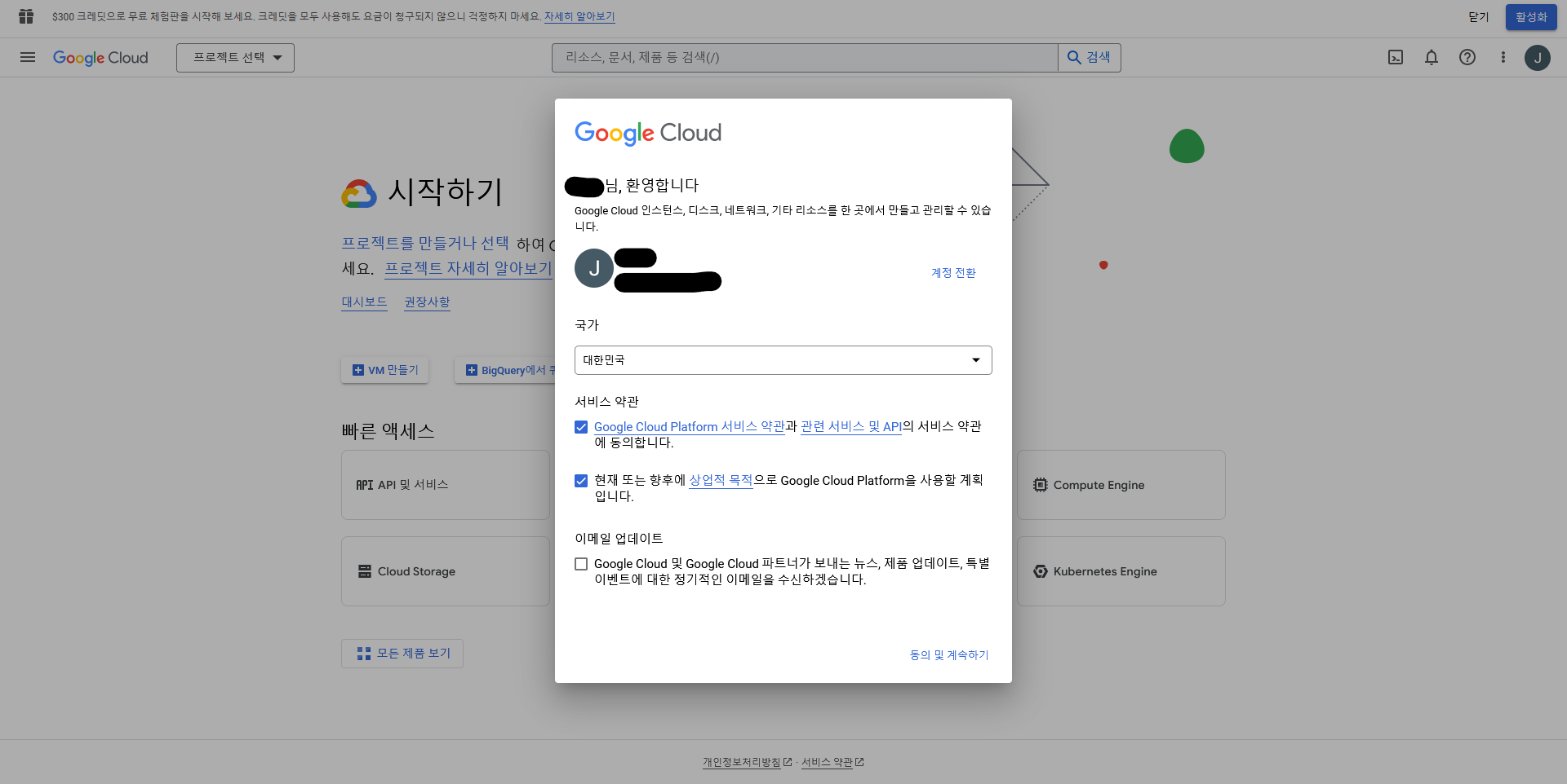 Console에 접속하기 위해 서비스 약관 체크하여 동의 및 계속하기를 클릭합니다.