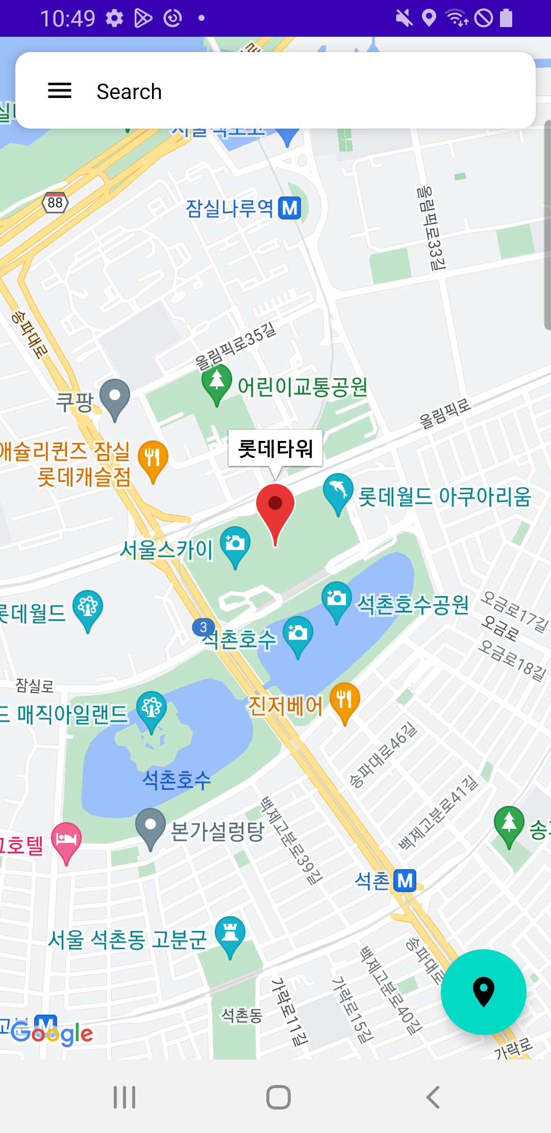 위의 예제는 Geocoder 클래스를 사용하여 getFromLocationName의 파라미터로 실제 주소 텍스트 (ex) "서울특별시 송파구 올림픽로 300")와 주소의 갯수를 전달합니다.(주소의 갯수는 1 ~ 5 중 값으로 전달하는것을 권장합니다.)