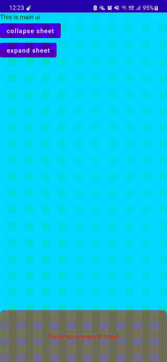 val scope = rememberCoroutineScope() val scaffoldState = rememberBottomSheetScaffoldState() BottomSheetScaffold( sheetContent = { Box( Modifier .fillMaxWidth() .height(128.dp), contentAlignment = Alignment.Center ) { Text("Swipe up to expand sheet") } Column( Modifier .fillMaxWidth() .padding(64.dp), horizontalAlignment = Alignment.CenterHorizontally ) { Text("Sheet content") Spacer(Modifier.height(20.dp)) } }, scaffoldState = scaffoldState, sheetPeekHeight = 128.dp, sheetShape = RoundedCornerShape(10.dp), sheetBackgroundColor = Color.Gray, sheetContentColor = Color.Red, ) { Box( Modifier .fillMaxSize() .background(Color.Cyan) ){ Column() { Text("This is main ui") Button( onClick = { scope.launch { scaffoldState.bottomSheetState.collapse() } } ) { Text("collapse sheet") } Button( onClick = { scope.launch { scaffoldState.bottomSheetState.expand() } } ) { Text("expand sheet") } } } }
